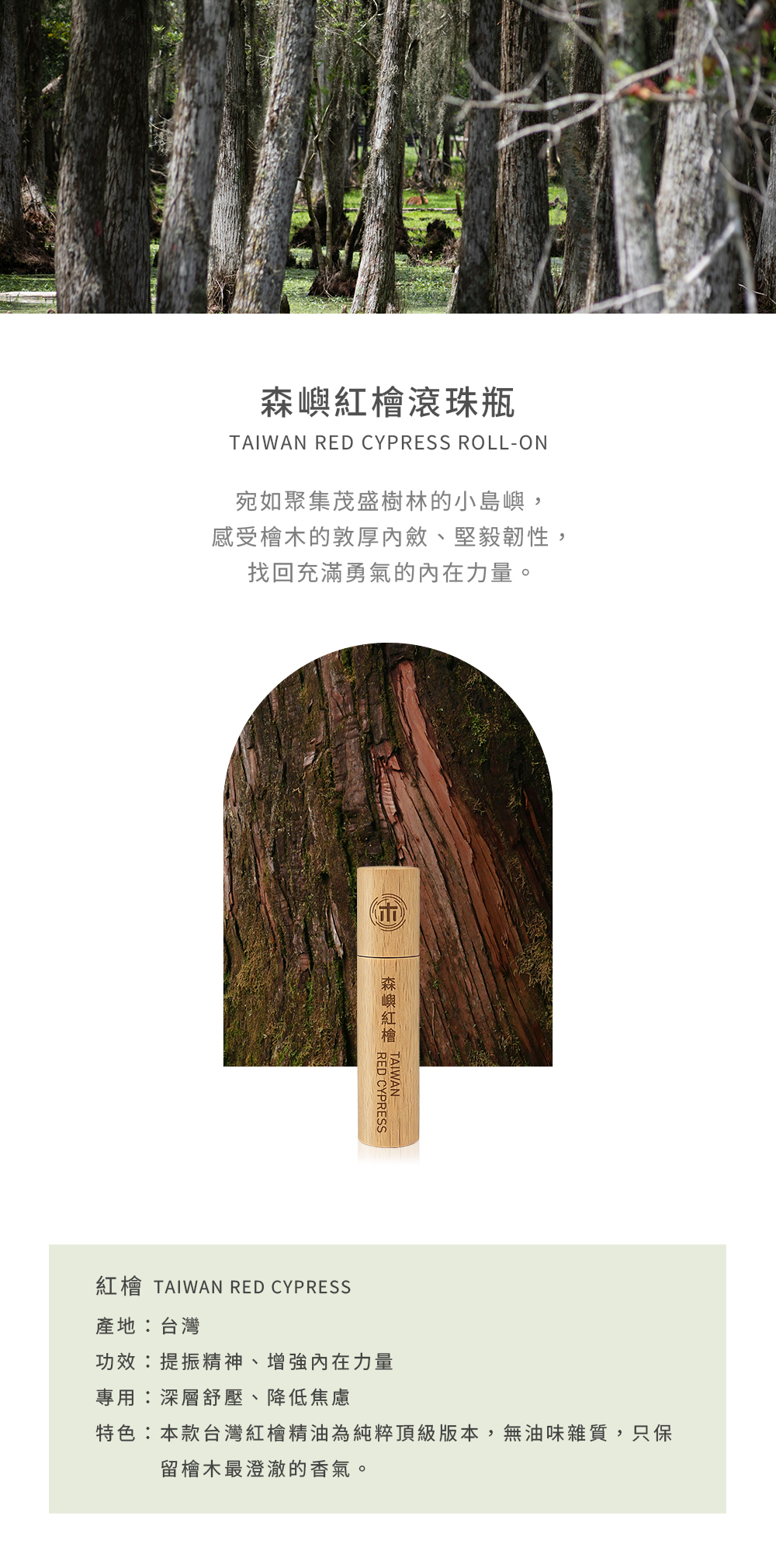 宛如聚集茂盛樹林的小島嶼,享受陽光灑落、溫度微高,臉頰微微紅潤,身體散出些許熱氣,感受到如同檜木的敦厚內斂、堅毅韌性,找回充滿勇氣的內在力量。